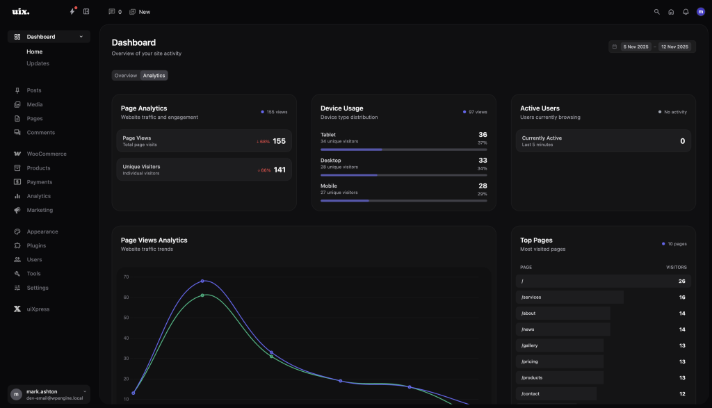 Say goodbye to the cluttered default WordPress dashboard. uiXpress 1.2 introduces a completely redesigned dashboard experience with powerful built-in analytics that give you real insights into your site’s performance.