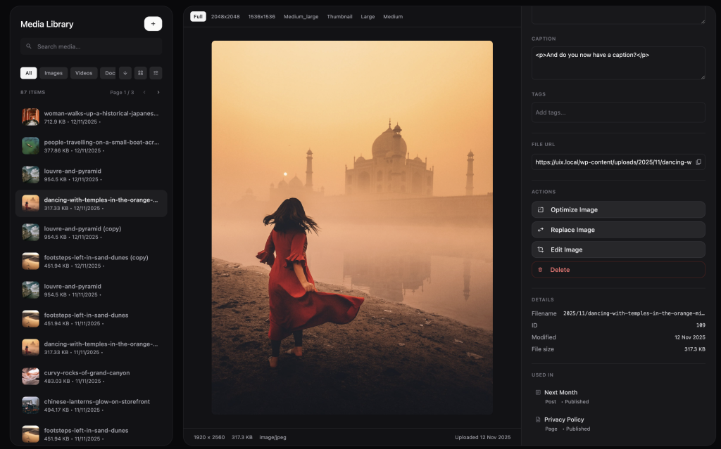 The new Media Library is built with Vue.js 3 and features a beautiful dark mode interface that matches the rest of uiXpress. Whether you’re managing a handful of images or thousands of files, the experience is fast, intuitive, and powerful.